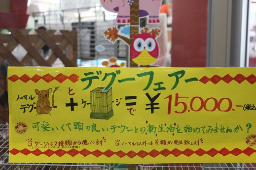 デグーフェア、やってます 小動物の事 2017年02月17日 こんにちは、 近々、諭吉中隊が全滅する予感しかしない店長ですヾ(´ρ`)ノ゛ワーイ そんな浪費癖の治らない中年男性は無視して、 当店でもやってます!! デグーフェア!! ※当店ヲタクスタッフ キュア・ビール氏 作 当店指定の「デグー」ちゃんと、 サンコー社の「イージーホーム37HI」or 「イージーホーム40HI」が セットで ¥15,000 !! ¥15,000ッ!!!! 通常ならデグーとケージ合わせて¥20,000以上しますので、 ¥5,000以上お徳です 「デグー」を飼ってみようか迷っている方には、 とってもチャンスです 飼い方に不安がある方も、スタッフがばっちりご説明しますので、 ぜひぜひご検討ください [5回]