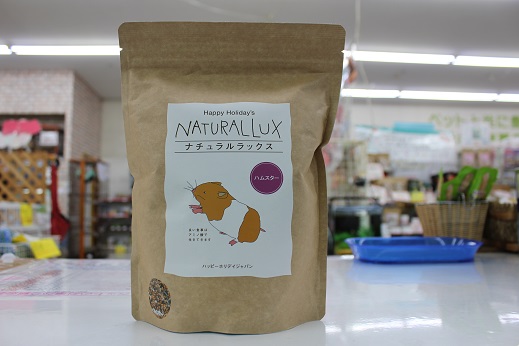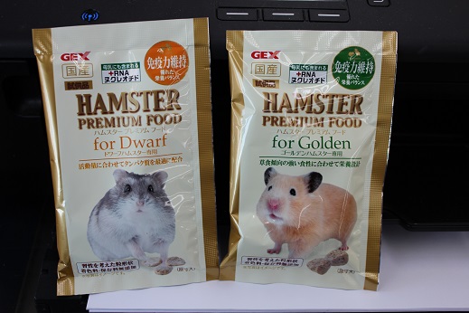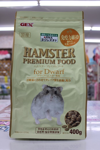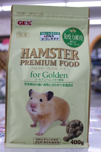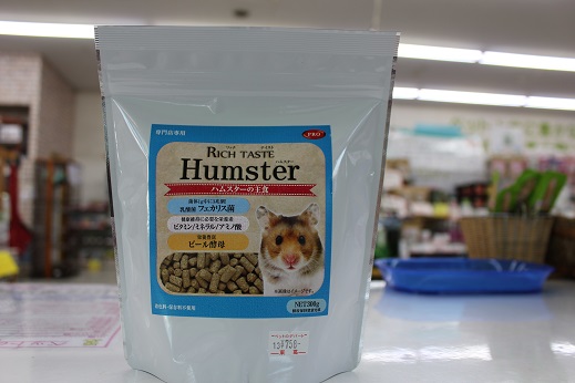 ハムスターフード紹介 小動物の事 2018年02月14日 皆様こんにちは、藤子です。 今日は数あるハムスターフードの中で4つのフードを紹介いたします(人´v`) 1つ目は 『ナチュラルラックスハムスター』 こちらはお店のハムちゃんにもあげているフードになります。 穀物類のブレンドフードになります。 最高品質の種子を原料としてブレンドフードの問題点を解決するために開発されたフードです。 ビタミン・アミノ酸を充分に補い、必要な栄養素のバランスを保ち、健康を維持してくれます。 2つ目は 『リッチテイストハムスター』 こちらもお店のハムスターにあげています。 このフードは乳酸菌フェカリス菌・ビタミン/ミネラル/アミノ酸・ビール酵母が 配合されています。 気になるのが「乳酸菌フェカリス菌」 この乳酸菌は球状の非常に小さな乳酸菌で数ある乳酸菌の中でも免疫力を高める効果に 優れています。加熱殺菌処理をすることで胃酸の影響を受けずに腸まで届き善玉菌を 増殖させる働きがあります。 毎日の食事から健康を手助けしてくれます。また、歯の伸び過ぎを抑えるために 適度な硬さになっています。 3つ目は 『ハムスタープレミアムフード ゴールデンハムスター専用』 ゴールデンハムちゃん専用フードです。 ゴールデンはドワーフハムスター(ジャンガリアンハムスターなど…)に 比べると植物性の食べ物を多く必要とします。健康維持のためタンパク質と脂肪を 抑えた低カロリーなフードです。 4つ目は 『ハムスタープレミアムフード ドワーフハムスター専用』 ドワーフハムちゃん専用フードです。 活発なドワーフハムスターは多くのエネルギーを必要とするため 脂質に頼らずに高タンパクに仕上げたフードになっています。 ハムスタープレミアムフードは2種類とも試供品がありますので 是非試してみて下さい。 今日はここまでとなります。 最後まで見てくださってありがとうございました(*^▽^*) 皆様のご来店、心よりお待ちしております。 ではでは~ [6回]